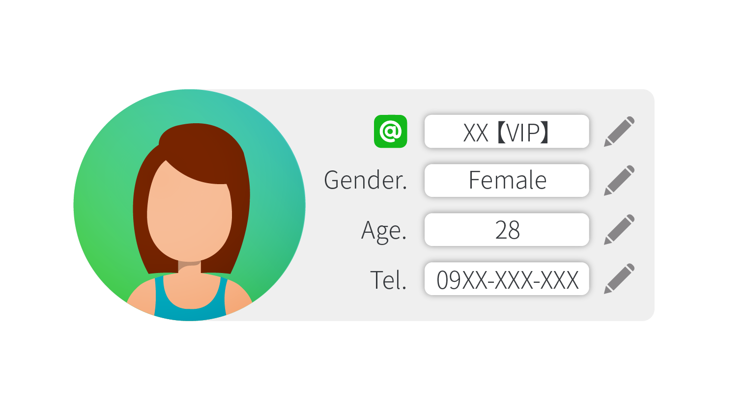 VERY 1讓LINE@中的客戶,不只是客人自己設定的「客戶名稱」,而是對應婚紗工作室的客戶資料,彷彿客戶識別證般,為LINE官方帳號加上「客戶流水編號」、「客戶姓名」、「服務門市姓名」,打開LINE@,就如同打開「客戶訂單」系統一樣,所有的服務都可以一手掌握!